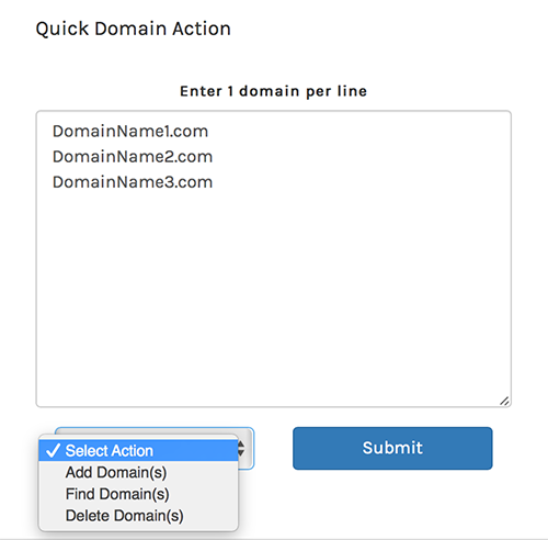Enter (or copy-and-paste) domains, one per line. Then choose the action you want to perform in the drop-down list: Add Domain(s), Find Domain(s), or Delete Domain(s).