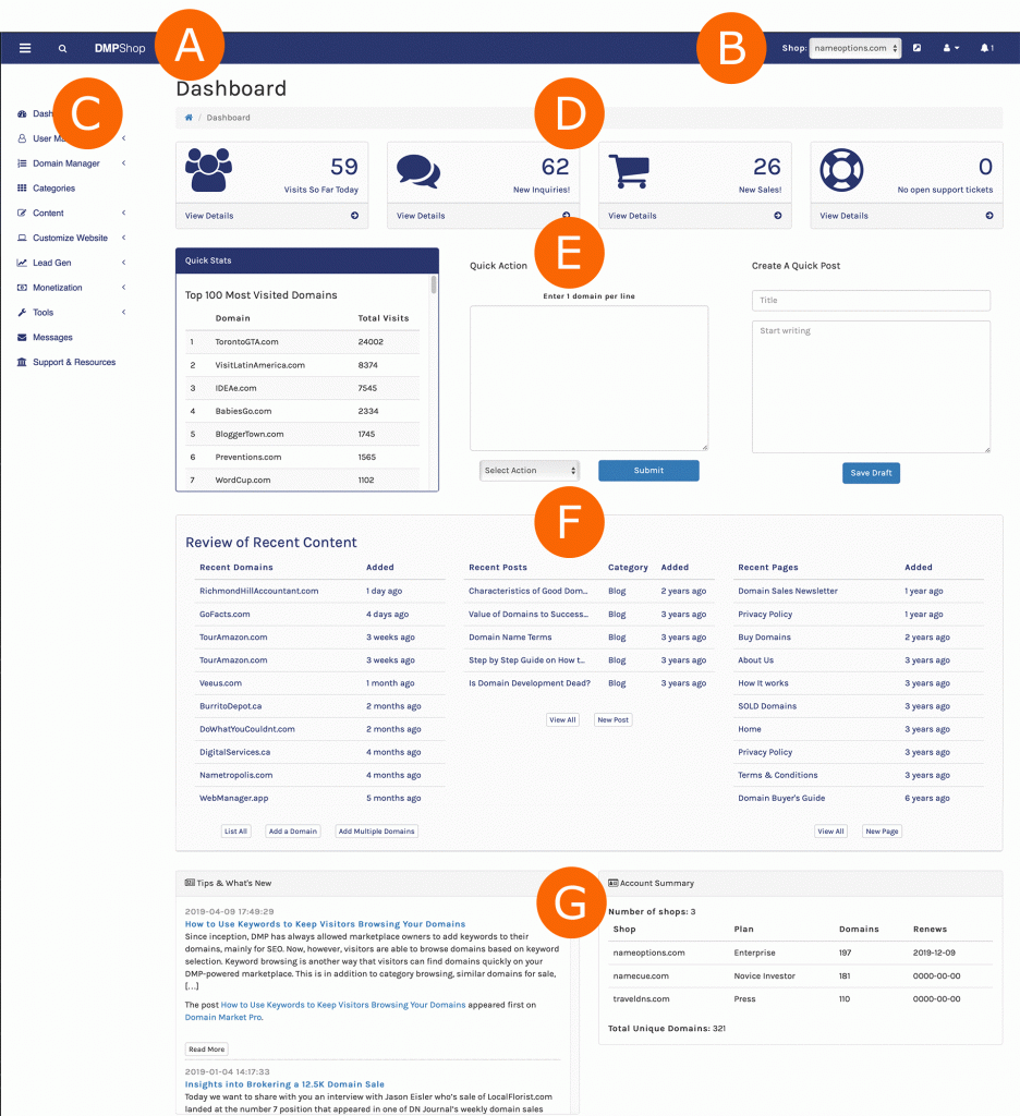 Alert boxes that let you know current activity: Visit So Far Today, Number of Inquiries, Sales, and and open Support Tickets.