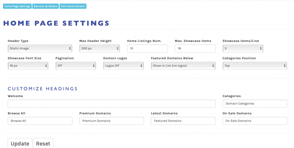 Home Listings – Select the number of domains you want listed in the different sections, such as Latest, Premium, Sale, etc.