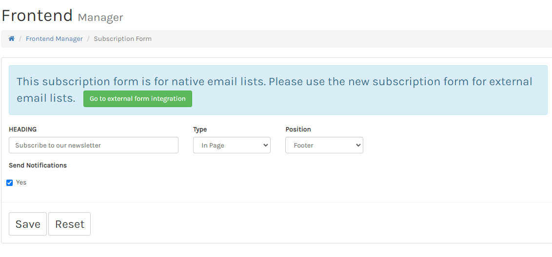The first page you will see is for the native email subscription form. Enter a heading of your choice for the form, for example, "Subscribe to Our Domain Announcement List" or anything else appropriate. The next option, type will display the form on screen if you choose "in page", or as "modal". If you select modal, a button will activate a fly-in box with the subscription option. The option, position, allows to display the form in the footer or not. The "none" option can be selected if you want to create a page dedicated for email subscription that can be accessed from the menu.
