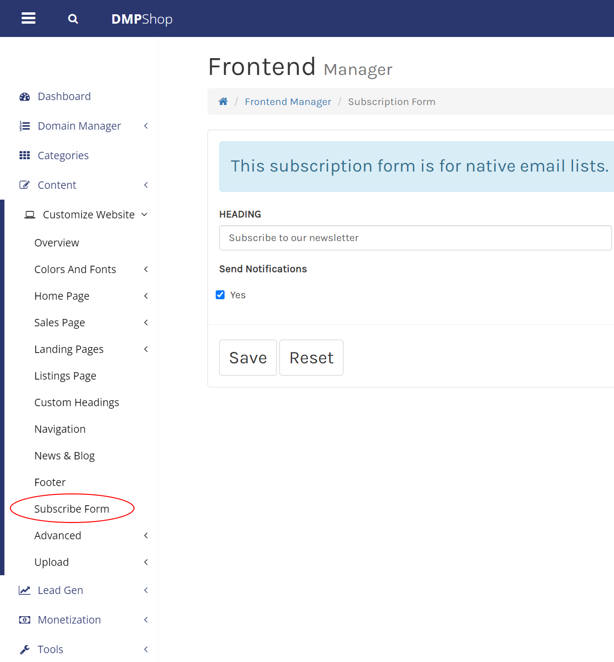 Domain Market Pro gives you flexible options to create email lists which you can use to save leads generated through your DMP shop. This includes a internal native list builder and the capability to integrate third-party email marketing tools such as MailChimp. If you want integrate a subscription form from another provider go to Integrating 3rd Party Email Lists. Here we will take you through the internal native email list builder.