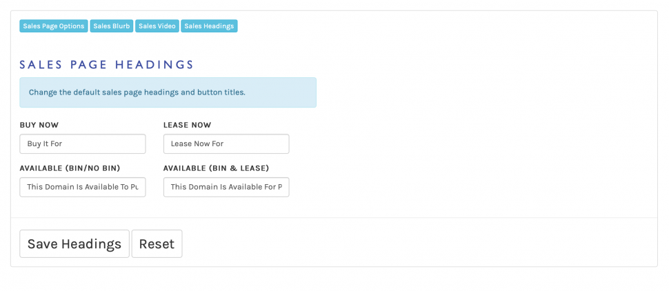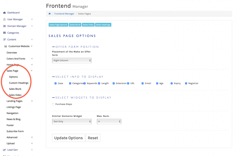 You can customize the sales pages under Customize Website, then Sales Page. There are 4 menu items under Sales Page: Options, Custom Headings, Sales Blurb, and Sales Video. Here is what you can accomplish under each item.