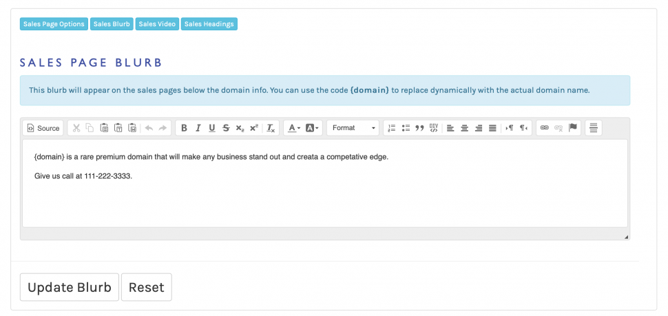 The sales blurb is text that appears on ALL domain sales pages below the individual domain comment section.
