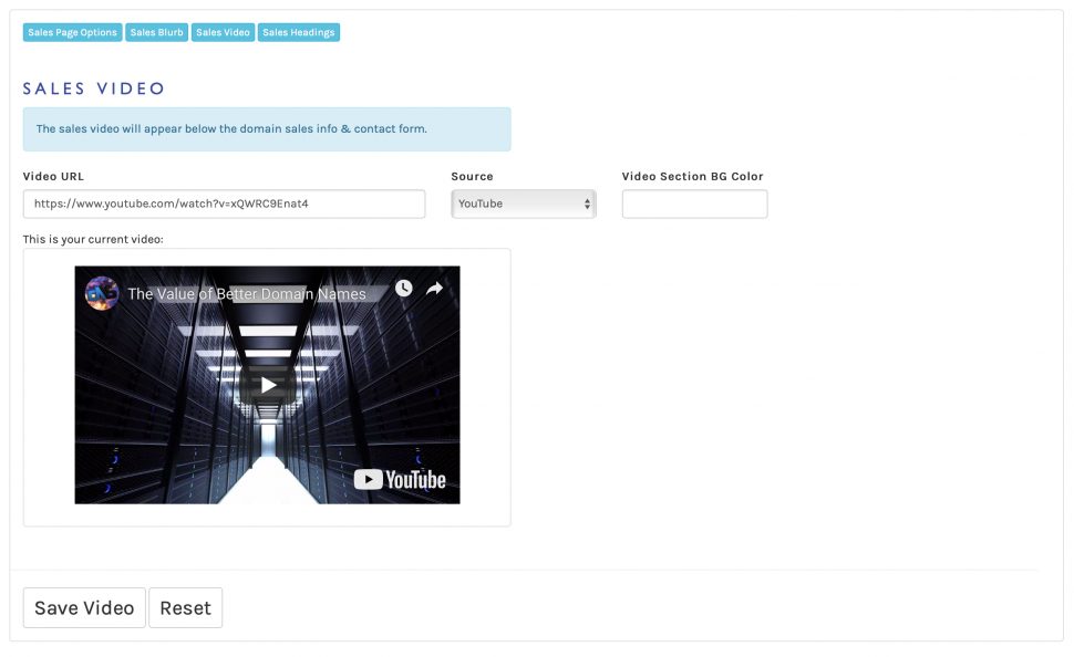 A sales video can be a talking head about the benefits of owning a valuable domain, a video explaining the value of domains, a video describing the company (the marketplace) and the process of acquiring a domain, or a combination of these topics.